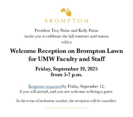President Troy Paino and Kelly Paino invite you and a guest to celebrate the successful start of the fall semester on Friday, September 19, 2025, from 5 to 7 p.m. with a welcome reception on the Brompton Lawn. Please complete the response form by Friday, September 12, to let us know that you’ll be there. In the event of inclement weather, the reception will be cancelled.