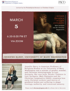 Associate Professor of Religious Studies Jennifer Barry presented two invited talks this week on her recent book, Gender Violence in Late Antiquity: Male Fantasies and the Christian Imagination (2025).